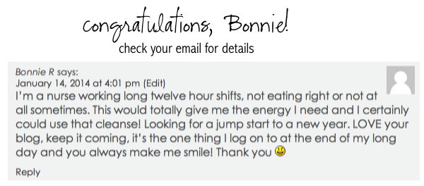 I’m a nurse working long twelve hour shifts, not eating right or not at all sometimes. This would totally give me the energy I need and I certainly could use that cleanse! Looking for a jump start to a new year. LOVE your blog, keep it coming, it’s the one thing I log on to at the end of my long day and you always make me smile! Thank you π