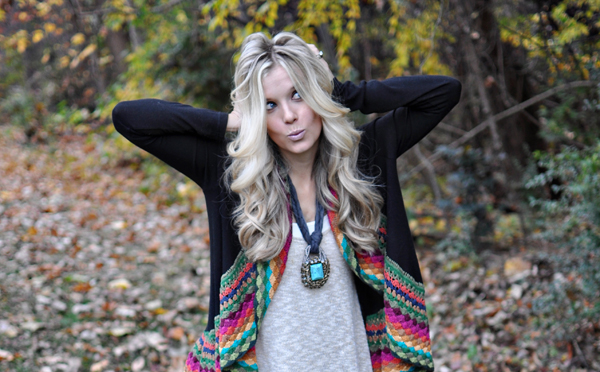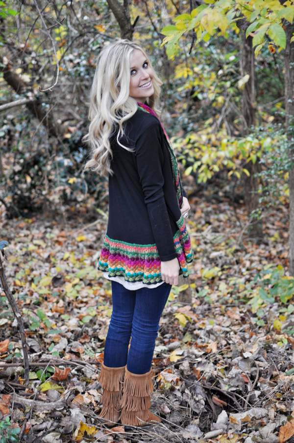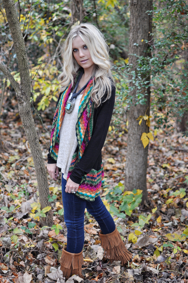 OUTFIT DETAILS: Boots – Minnetonka 3-Layer Fringe Boot, Jeans – AF, Tank – Nordstrom similar Living Doll Metallic Babydoll Tank (Juniors), Sweater – Modern Vintage Boutique, Necklace (old)- courtesy of ShopMamie similar HERE, Polish – Orly in Pure Porcelain, Hair – THIS tutorial
