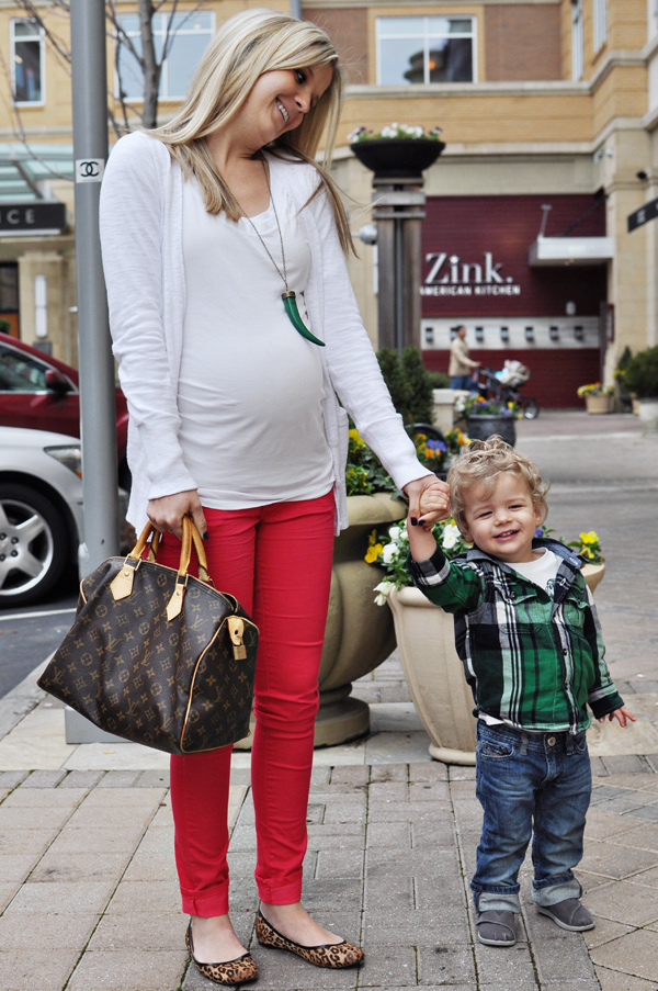 PLEASE share where you scooped up these adorable red skinny?! Are they maternity?! Love the horn necklace too!