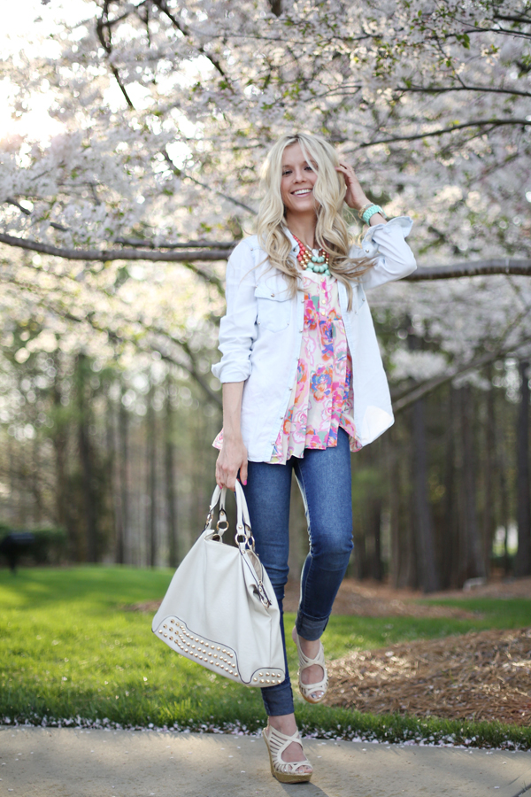 Ah spring has not quite sprung here yet in Calgary but your photos are making me optimistic for when it does arrive! Love the mixed media and prints with the necklace/top!