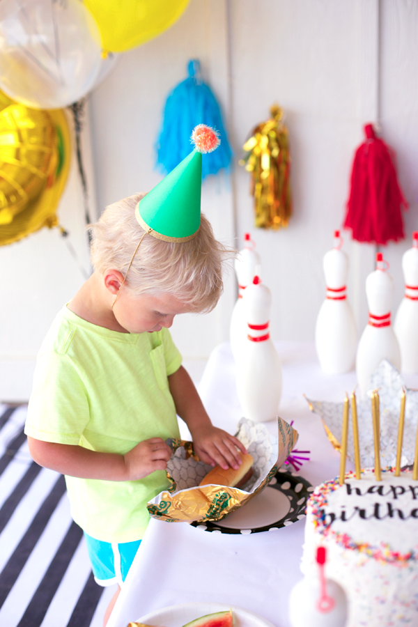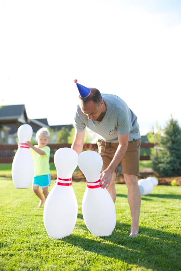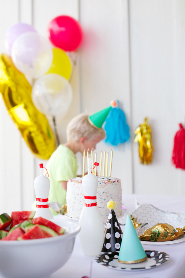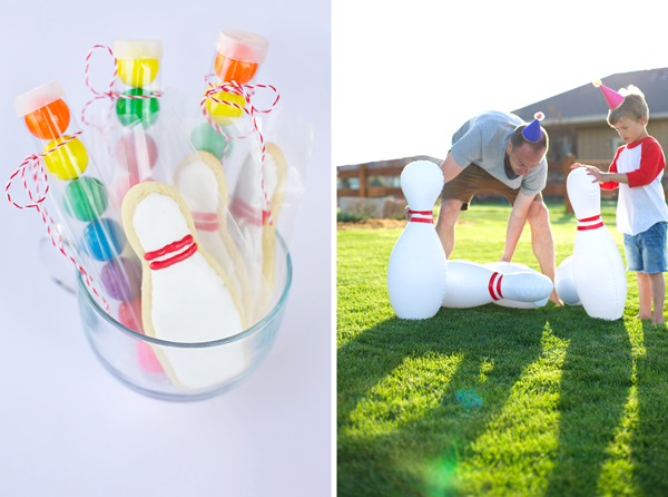 I mean, when they both request a bowling birthday party — you count your lucky stars, combine two birthdays into one, and say, “booya!” with an extra emphatic high-five to your Husby! There was a brief instant when we thought of celebrating at the actual bowling alley (of course, which would’ve been fun) but I kept running into giant bowling-related everything’s: bowling pin water bottles, numeral balloons, and the huge bowling inflatables… it was a sign to keep it comfy at home. Ryan somehow survived the gruesome games of becoming a ‘Human Piñata’ — taking one too many whacks to the head from the weighted pins. Yowchie! That’s real love right there, peeps.