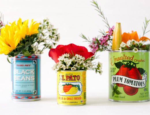 Should you be fiesta’ing at la casa, don’t toss dinner’s cans and bottles! Repurpose them for festive floral centerpieces — party in a can! woot woot! Grab a mixed bouquet at TJ’s for under…