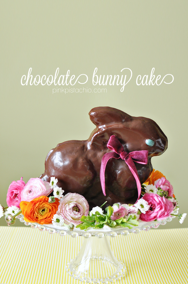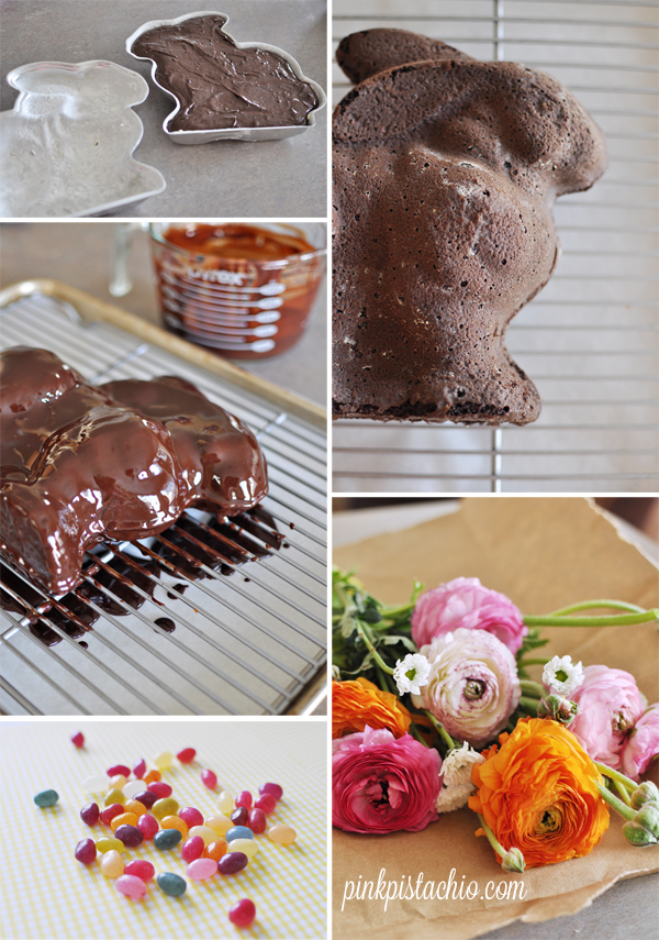 - 1 grease and flour both sides of cake pan. 2 fill one side (w/o vent) nearly full of chocolate cake batter (~3 cups of homemade or cake mix). 3 place on cookie sheet and bake in preheated 375 degree oven for 40 minutes, or until toothpick comes out clean (use vent hole). 4 let cool 5 minutes before carefully removing pans. 5 transfer to a wire rack resting over a cookie sheet, to cool completely. 6 once cooled, spoon chocolate ganache evenly over bunny. spoon additional chocolate to coat the underside slightly. 7 add a jelly bean for the eye. 8 refrigerate until chocolate hardens (chocolate will still be tacky when set, so handle carefully). 9 transfer to a doily lined cake stand 10 garnish with fresh flowers and a velvet bow (use a dab of wet ganache on the backside of bow to act as glue). 11 serve with additional warm ganache and/or whipped cream. ganache: microwave 1 cup heavy whipping cream with 1 and 1/2 cups chocolate chips (combination of both semi-sweet + milk chocolate) for 15 second increments, stirring in-between, until completely melted. let cool to almost room temp before decorating.