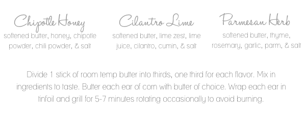 I actually was planning on making corn tonight! Looks like I will be trying one of these butters and throwing it on the grill! Yummers! P.S. I made your Panera poppyseed salad last week and it was so good! I just got one from Panera for lunch and it was good but I actually like yours better!