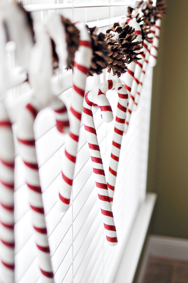 A garland of shabby pinecones mixed with chic candy canes makes enjoying mealtimes more festive.