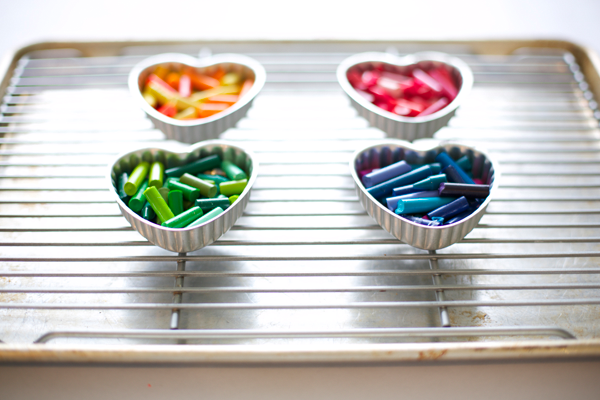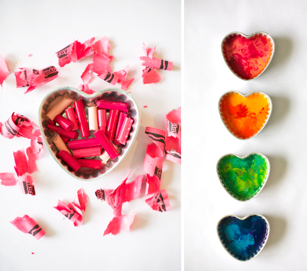 Preheat the oven to 250 and melt for 15 minutes. Once cooled, pop out of the molds (muffin or silicone pans work too). Package in cellophane bags stuffed with paper peelings, with a tag saying: Valentine, you make my heart melt!