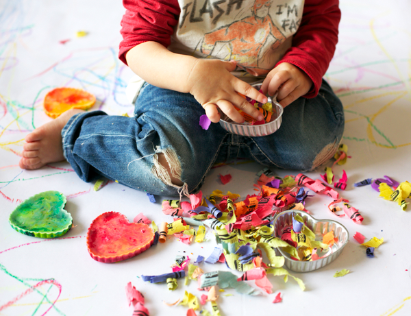 Earlier this week we spent the whole morning making and coloring with heart crayons. I spotted these aluminum molds at an antique store last year and had to have them! The boys loved sorting by color, peeling off the paper, and snapping them in bits!