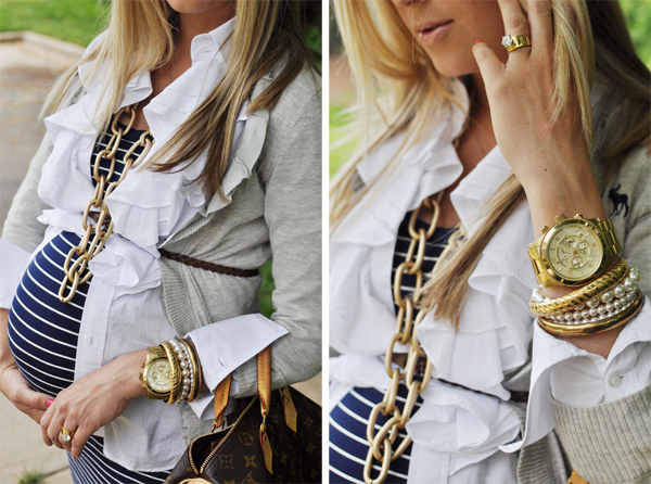 • WARDROBE: dress – target maternity, ruffle cardigan – Abercrombie & Fitch, Ruffle Blouse – Ralph Lauren, Chain necklace – gifted, Bracelets – F21, Watch – Michael Kors, Shoes, Michael Kors, Belt – BP @ Nordstrom, Bag – Louis Vuitton, Polish – Passion by Gelish