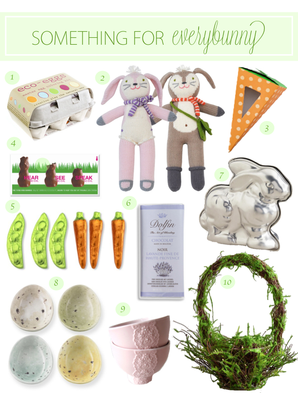 Easter! Have you thought about it? Yikes. Me neither. Before it’s here, I thought I’d share a few of my favorite Easter finds. The carrot boxes. How perfect would those be for a slice of carrot cake to give to friends? Or the bunny cake pan… dress it in ganache and call it a chocolate bunny!