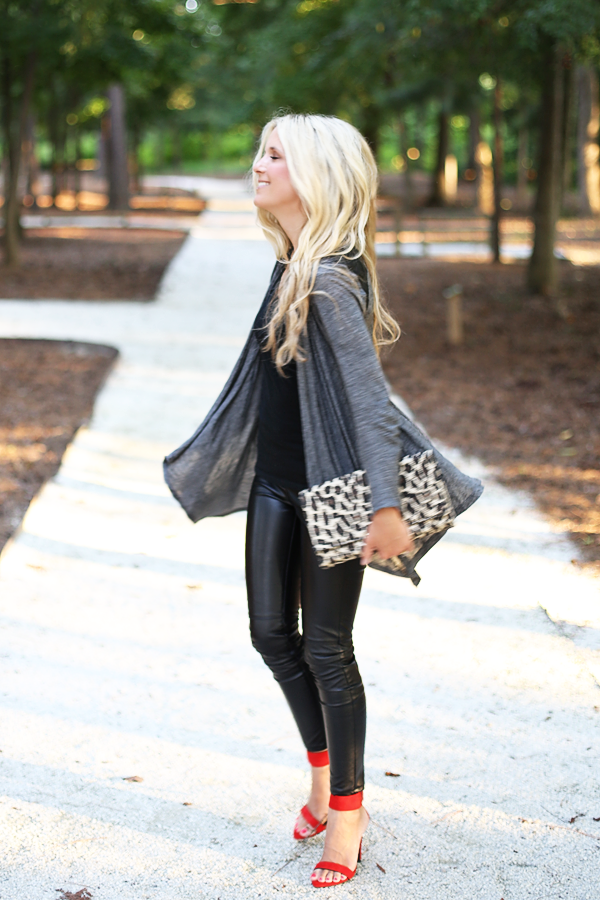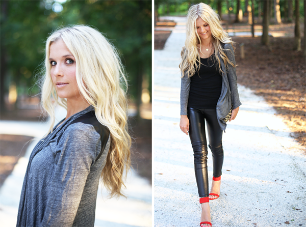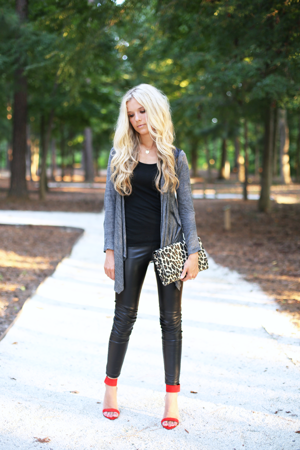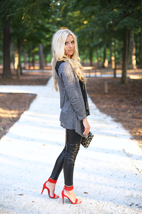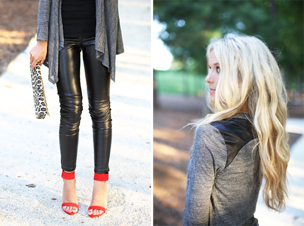 So pretty! LOVE this outfit.. I have always wanted to get a pair of leather pants and those red heels definitely completes the look!! π