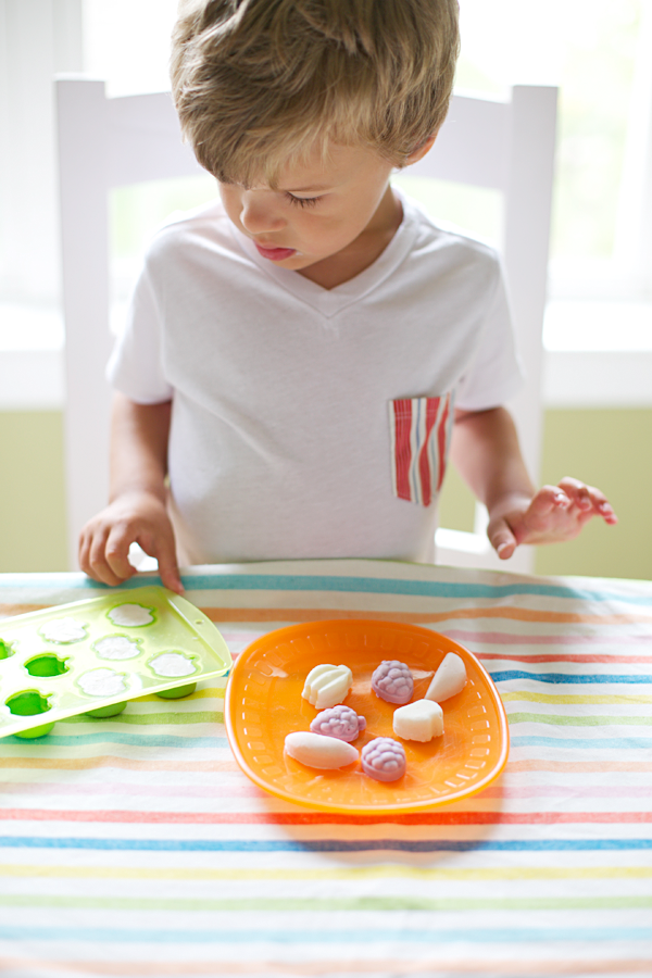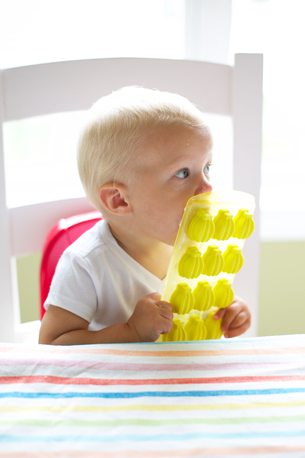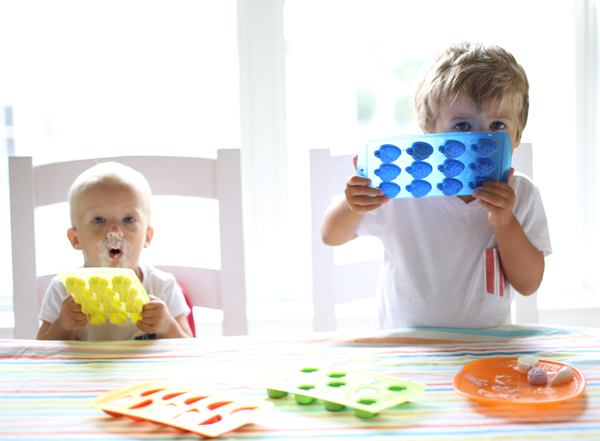 My boys love yogurt and equally love popsicles just as much. Leave it to the $1 section at Target to always spark good ideas. The fruit ice-cube molds just begged to be filled with fruit flavored yogurts. Before naptime, spoon or pipe yogurt into the molds, freeze for at least an hour (or hopefully more if your nugget is taking an extra long snooze), remove from freezer and let sit 10 minutes before popping out for snacking.