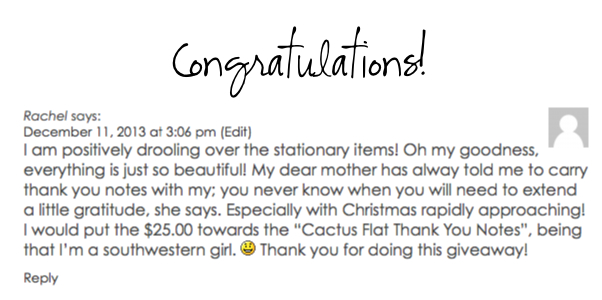 I am positively drooling over the stationary items! Oh my goodness, everything is just so beautiful! My dear mother has alway told me to carry thank you notes with my; you never know when you will need to extend a little gratitude, she says. Especially with Christmas rapidly approaching! I would put the $25.00 towards the “Cactus Flat Thank You Notes”, being that I’m a southwestern girl. 🙂 Thank you for doing this giveaway!