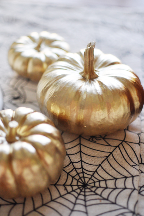 Faux-leafed mini pumpkins curtesy of a trusted can of metallic spray paint!