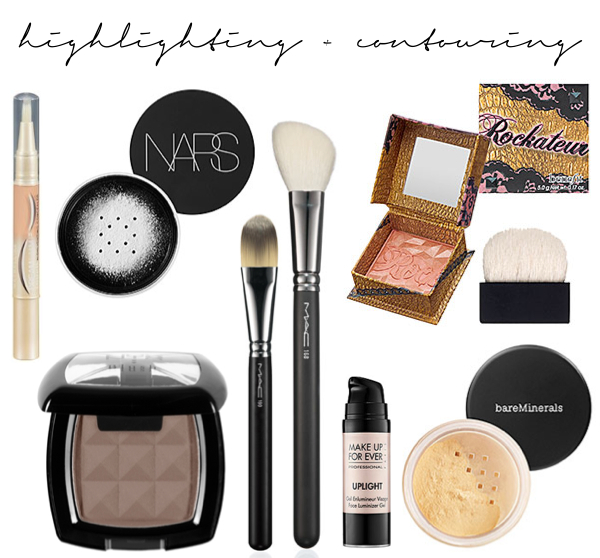 - setting powder: NARS Light Reflecting Loose Setting Powder | highlighter: Maybelline Dream-Lumi in Nude or Ivory | powder concealer: bareMinerals in Well-Rested | contour: NYX eyeshadow in Taupe | blush: Benefit Rockateur | luminizer: Make Up Forever #11 in Dewey Pink | highlighting brush: MAC | contour brush: MAC | eyeshadow brush: MAC