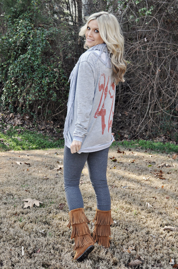 Missy, can you please share where you got the scarf and leggings? I have those boots and love how the fringe works with them. XOXO