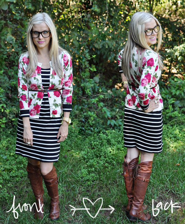 - Floral Cardi – F21, Dress – Old Navy, Belt – J.Crew, Boots – Me Too (old), Ring – Coach (old), Readers – BP Nordstrom (in store), Watch – Michael Kors
