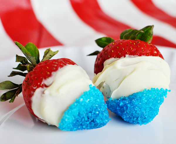 - Top – Strawberries dipped in white chocolate & sparkly blue sprinkles!
