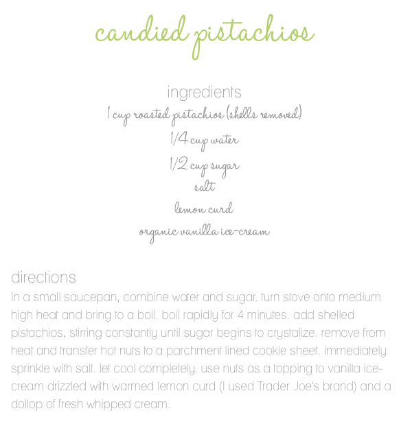 Some days asked to be finished with an ice-cream sundae (lately I seem to have a lot of those). This one goes beyond your ordinary chocolate sauce. The warm tart lemon curd combined with salty candied pistachios puts this as one of my new favorite splurges! But then again, I am kinda partial to pistachios (wink wink).