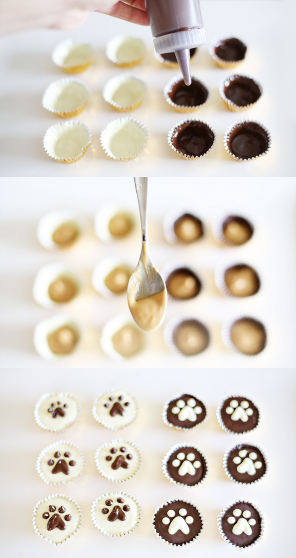 DIRECTIONS: fill squeeze bottles with melted carob and/or yogurt chips. line the sides and bottom of mini candy cups. transfer to the fridge to set (~5 min). use natural creamy pb to fill the cup halfway full. cover with more carob/yogurt. lightly tap the bottom of the candy against the counter to smooth the top. return to fridge to set (~5 min). apply paw print design.