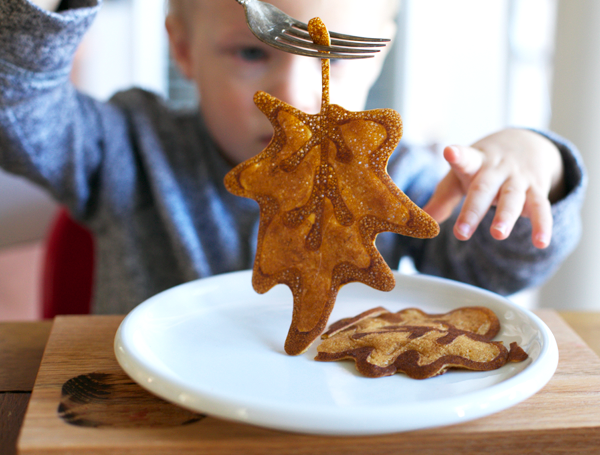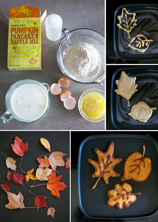 - Directions: 1 Prepare pancake mix according to package directions or favorite homemade recipe. 2 Pour batter into Wilton decorating bottle or even a turkey baster. 3 Preheat griddle on medium-low heat. 4 Melt butter on griddle. 5 Pipe stem, veins, and leaf outline. Let cook until dark brown. 6 Quickly pipe in the empty space and flip as soon as possible. tip: the variegated color comes from cooking the outline longer than the inside. 7 serve with maple syrup, toasted pecans, and/or whipped cream. (my boys preferred eating them plain with their hands).