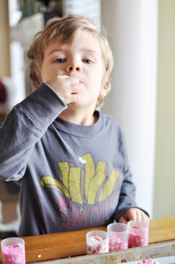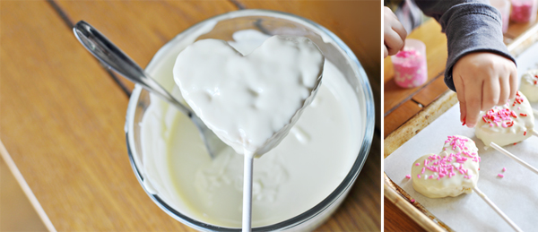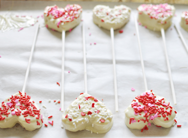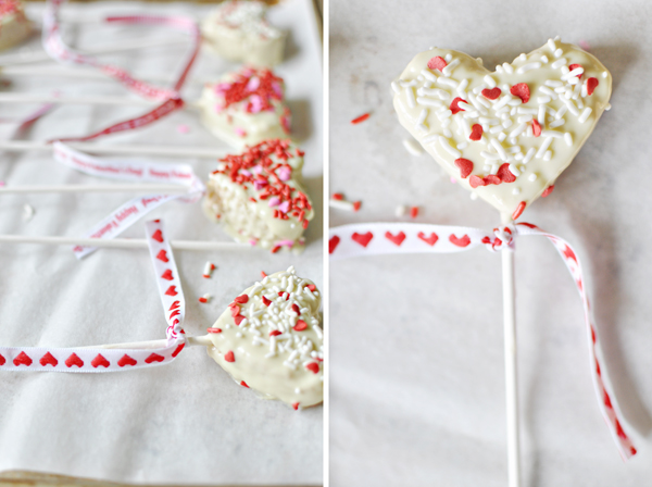 Stamp out hearts using a cookie cutter, poke them in the belly button with a lollipop stick, dip in white chocolate, cover in sparkles (Gage’s vocab is wearing off on me) sprinkles rather, and tie at the base with sweet ribbon.
