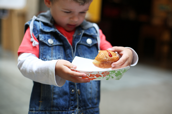 Hot homemade donuts. Didn’t have to ask the boys twice. ‘Uh… Mama? Is it supposed to bleed raspberries?’ Clearly, he’s used to chocolate with sprinkles.