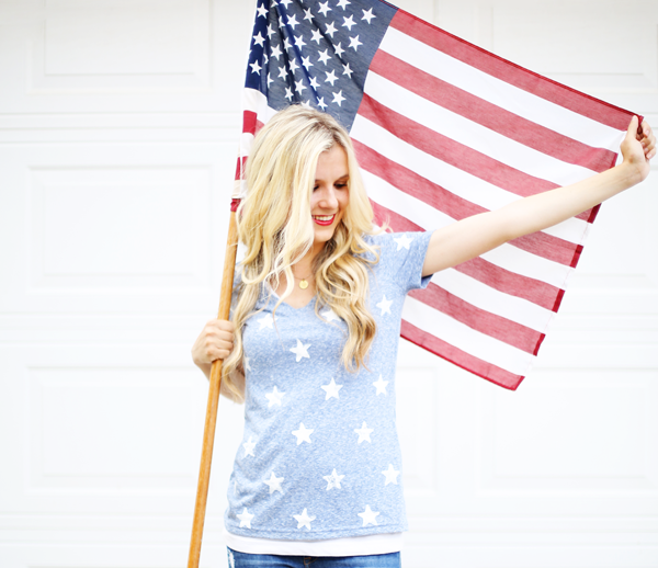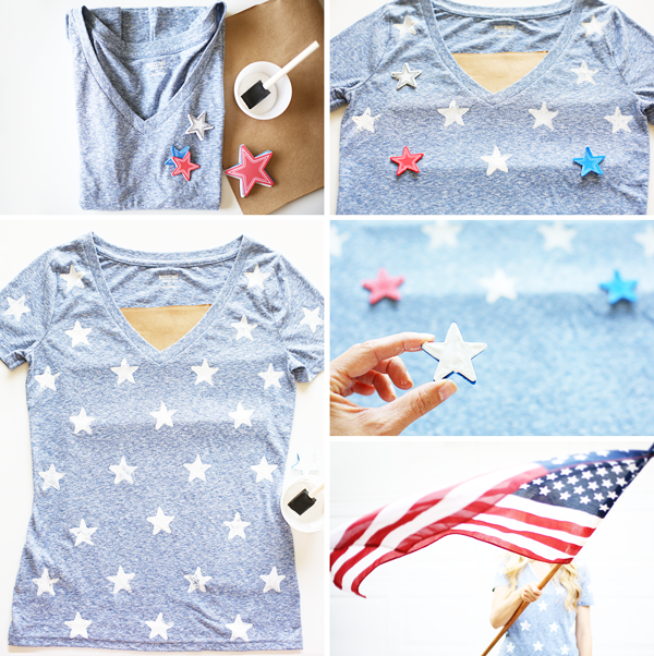 • Instructions: 1) use a brown paper bag or a piece of cardboard to place inside the tee to avoid paint seeping through to the backside. 2) make a star stamp from foam stickers (layered 3 high). 3) arrange stars in a pattern of choice – measuring may also be helpful. I alternated 4 and 3 to a row. 4) apply fabric paint to the star with a foam brush (using craft or acrylic paints – will wash out when laundered). apply a heavy layer that’s slightly messy (not evenly distributed). the irregular globes of paint help give texture and more of a distressed feel. 5) let dry 4 hours before repeating on the backside. Supplies: Tee – Mossimo at Target (in blue delta), Fabric Paint (matte glacier white) – HERE or Michael’s, Foam Star Stickers  – Michael’s