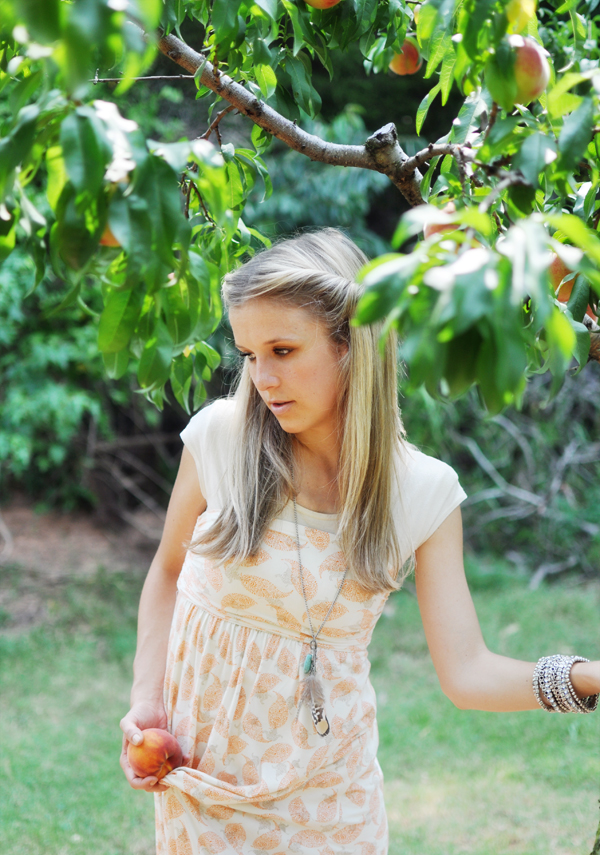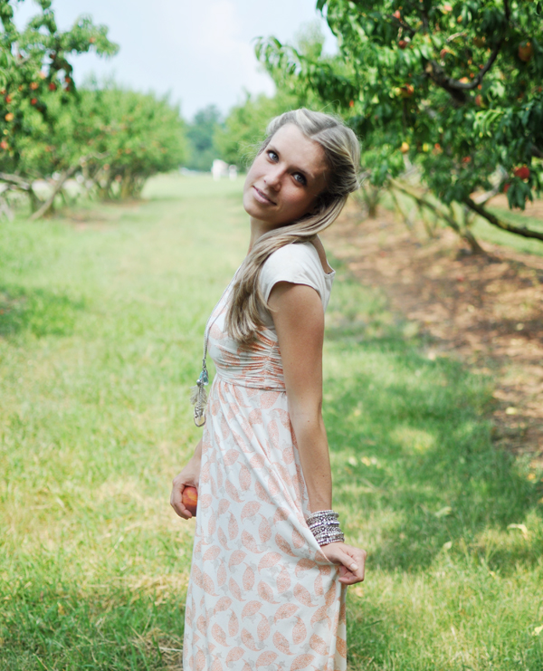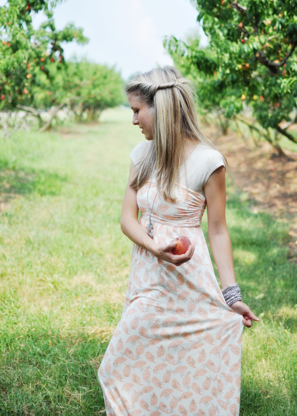 Life in my new favorite maxi is peachy keen, jelly bean! Slightly embarrassing that the neighbors have seen me wearing this lil’ lady… a’hem dare I say… numerous days in a row? It’s just THAT comfortable! The fabric is really soft, thick, with lots of stretch in the right places. It also so happens to be perfect for picking peaches…