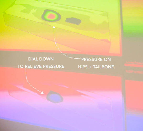 When it was my turn to try it out, I was surprised at how unaware I am about knowing whether my body is comfortable. I laid down at immediately thought, “Wow, this is so comfy! SOLD!” But I was taught that finding the right Sleep Number setting for my specific body is a process. I was asked if I could initially feel any pressure anywhere on my body. I wasn’t sure how to respond. I wasn’t sure?! See I’m not used to paying attention to how my body feels in bed. She dialed the Sleep Number setting down and told me to tell her when it felt like heaven. As I melted into the bed, I could feel my body relax and let go, “Stop! It feels like clouds.” I have a Sleep Number setting of 25. We then looked at a detailed analysis of pressure points and how that pressure melted away as we dialed down.