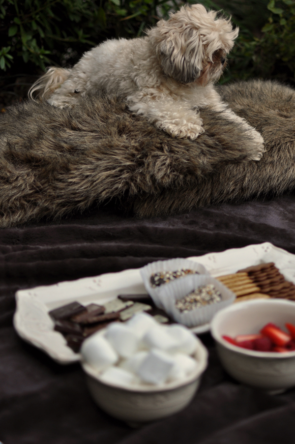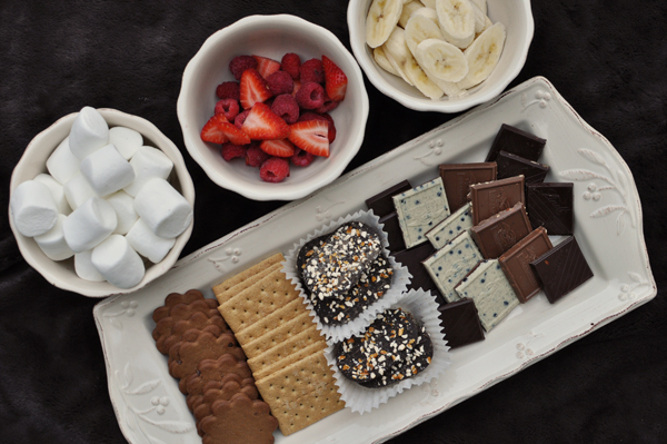 We added some unconventional s’more goodies: mint chocolate cookie wafers, cookies dipped in chocolate & pretzels, fresh fruit, and quality chocolate (salted caramel, orange, cookies n’cream, and milk).
