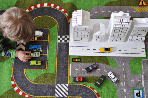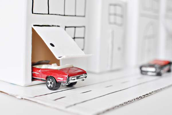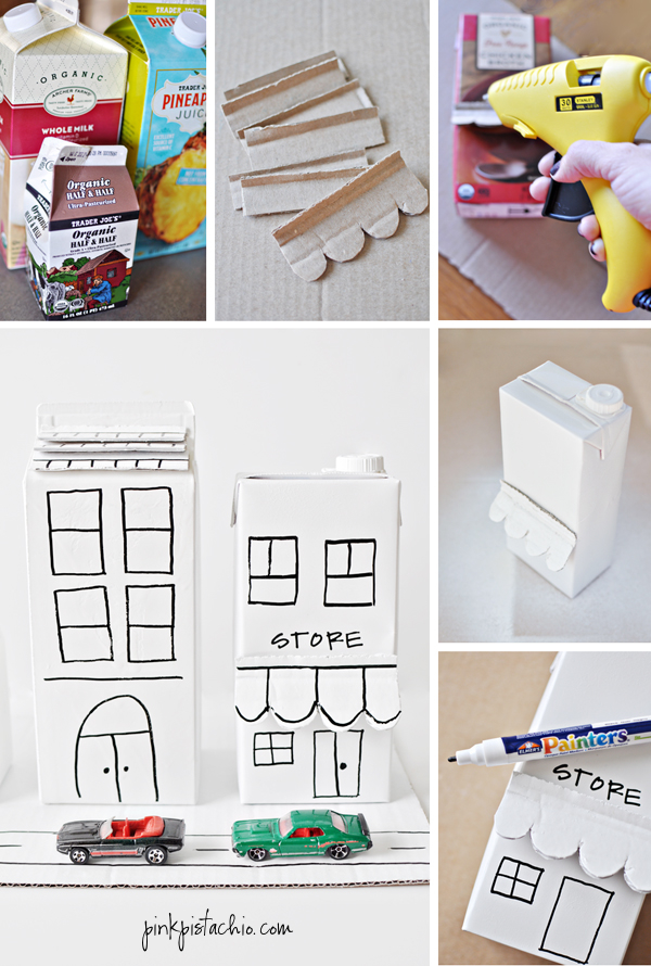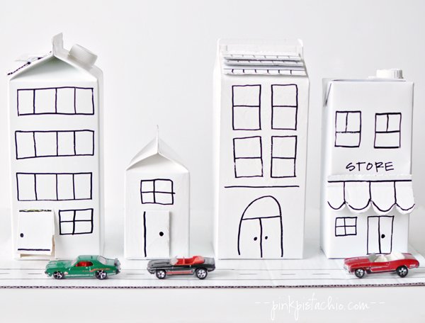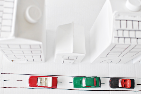 1 – save empty cartons and 1 shipping box. 2 – cut off one flap of a box to become the base of the city. with remaining cardboard, cut out building detailing (roof shingles, store awning, and/or doors). 3 – use hot glue to secure detailing to buildings. cut garage doors or open windows using an exacto knife. 4 – spray paint & let dry. 5 – draw additional building details with permanent marker or paint pen. 6 – fix buildings to base with hot glue.