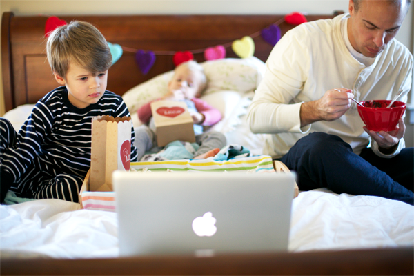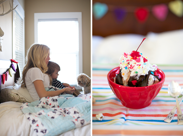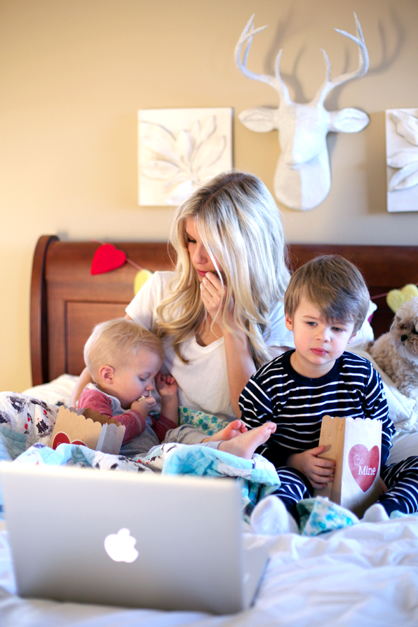 On Sunday we surprised the boys with an afternoon Valentine’s matinee! When they woke up from their naps, we took them into our bedroom where we munched on Ryan’s specialty — popcorn (he’s got the magic touch… perfect salt to butter ratio! ha). I made a whopper of a hot fudge sundae so we could all eat on it. We watched, The Emperor’s New Groove. Not very lovey-dovey. Hilarious. And that’s basically the same thing, right? Llama tell you what, it was an awesome afternoon!